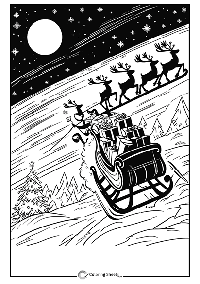 Whoosh! Color Santa and his reindeer as they glide down a snowy hill under the full moon with a sleigh full of gifts.