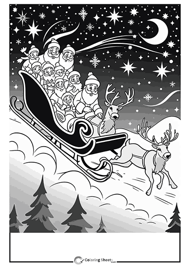 Santa has a sleigh full of helpers! Color this fun and festive scene of Santa and his team heading out to deliver presents.