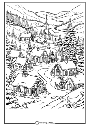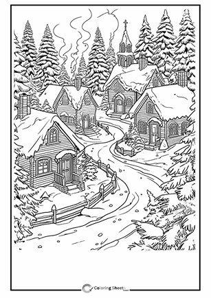 Step into a winter wonderland! Color this charming, snow-covered village decorated for the holidays.