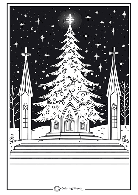 A whimsical and magical scene where the Christmas tree itself is a beautiful church. Let your imagination soar as you color this unique page.