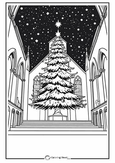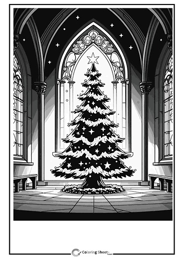 Color this magnificent Christmas tree standing in a grand, arched hall. Add your own sparkling colors to the ornaments and star.