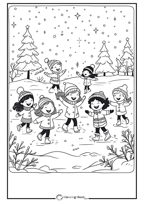 A joyful group of friends are having fun ice skating in a winter wonderland. Bring this happy, festive scene to life with color.
