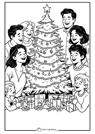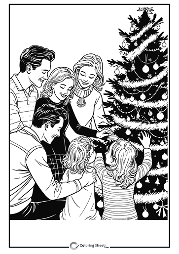 A beautiful family moment filled with love and warmth. Color this happy family as they admire their decorated Christmas tree.
